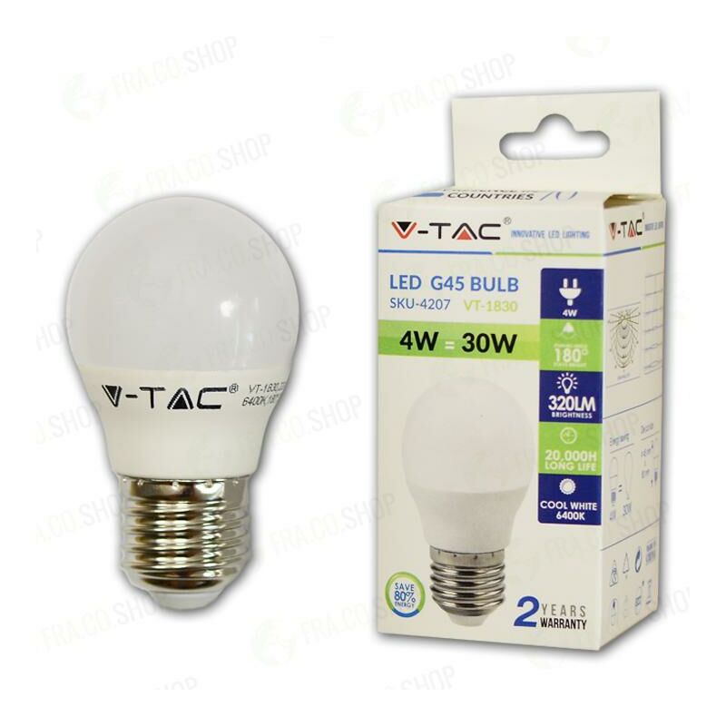 Lampadina LED 4W E27 P45 Bianco SKU: 4207: VT: VT-1830 Caratteristiche del prodotto 80% di consumo energetico in meno rispetto alle lampadine standard Lunga durata Nessuna emissione di radiazioni UV e radiazioni non ionizzanti Accensione immediata, nessun tempo di riscaldamento Bassa potenza termica Direttamente sostituibile alle lampade ad incandescenza tradizionali Installazione Aree Commerciali e Residenziali Hotel, Bar Stand espositivi Lampadari Allaperto, esclusivamente allinterno di apparecchi idonei. Specifiche tecniche Informazione generale Attacco E27 Tipo Lampadina G45 Tipo LED SMD Vita media >20 000h Dati elettrici Potenza 4W Potenza EQV. a incandescenza 30W Tensione AC: 220-240V Frequenza 50Hz Fattore di potenza >0.4 Dati tecnici Luce Colore della luce Bianco Temperatura di colore 6000K Flusso luminoso 320 lm Indice di resa cromatica Ra >80 Fascio Luminoso 200 ° Dettagli corpo Materiale Plastica, Alluminio Colore Bianco Funzionalità Dimmerabile No IP Protezione IP20 Tempo