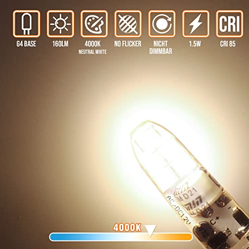 Lampadina LED G4 Bianco Neutro 4000K, AC/DC 12V 1.5W Senza Sfarfallio Lampade LED G4 Sostituzione della Lampada Pin Cap per Lampade Alogene 10W 15W, Lampada a Risparmio Energetico 160LM Lampadine LED