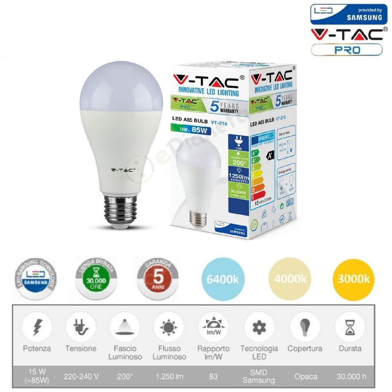 Lampadina LED V-Tac Pro VT-215 con potenza di 15W e attacco E27, forma a bulbo in materiale termoplastico e copertura opaca. I prodotti V-Tac PRO utilizzano chip LED Samsung di nuova generazione, garantiscono una durata di 30000 ore, un'affidabilità superiore alla media e una più elevata efficienza energetica. Questo prodotto ha una garanzia di 5 anni. Caratteristiche tecniche Modello A66 Tensione nominale 220-240V Potenza 15W Chip led SMD Samsung Attacco E27 Luce disponibile 6400k-4000K-3000k Flusso luminoso 1250lm Vita media 30000h Dimmerabile No Copertura Opaca Dimensioni Altezza 134 mm Diametro 66,5 mm