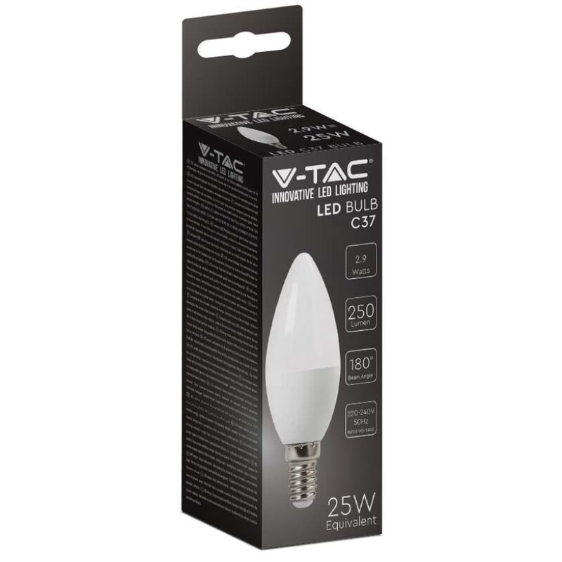 Lampada LED V-TAC 2.9W lampadinaE14, forma candela in materiale termoplastico e copertura LED SMD Opaca. Fascio luminoso di 180 e flusso luminoso di 250lM (86LM/W).Codice 2984 Tipo di attacco: E14 Tipo di LED: SMD Alimentazione: AC 220-240V, 50Hz Potenza: 2.9W Potenza (equivalente ad incandescenza): ~ 25W Colore della luce: Bianco caldo (3000K) Materiale / Copertura Lampada: Termoplastica di colore bianco con copertura LED opaca. Flusso luminoso: 250LM - 85 LM/W Apertura fascio luminoso: 180° Dimensioni: Φ36.5x100mm Dimmerabile: NO Consumo energetico: 3KW/1000h Vita media: 25.000h Classe energetica: F Dimmerabilità: NO CRI > 80 PF >0.4