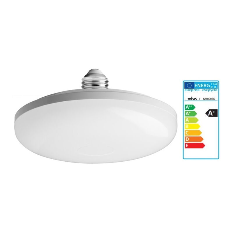 LAMPADINA LED DISCO OPALE E27 16W 4000K LUCE NATURALE Caratteristiche generali Tensione di funzionamento (V): 220-240 Potenza nominale lampada (W): 16 Corrente di lampada (A): 0.140 Attacco: E27 Frequenza di funzionamento (Hz): 50/60 CCT (K): 4000 Tipologia di colore: LUCE NATURALE Caratteristiche dimensionali Diamentro (mm): 150 Lunghezza (mm): 80 Prestazioni Flusso luminoso (lm): 1440 Efficienza (lm/W): 90 Fattore di potenza: >0.5 Resa cromatica: >80 Durata di vita (h): 25000 Classe energetica:A+ Consumo in kWh/1000h: 16 Altre caratteristiche Numero di cicli ON/OFF: > 20000x Tempo di riscaldamento fino al 60% del rendimento totale: ISTANTANEO Tempo di innesco (s): < 0.5 Dimmerabile: NO Temperatura ambiente di utilizzo: -20 / +40