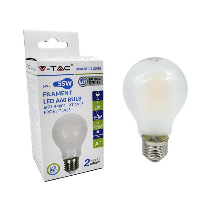 Lampadina LED - 6W Filament E27 A60 Opaco 3000K SKU: 4480: VT: VT-1935 Caratteristiche del prodotto 80% di consumo energetico in meno rispetto alle lampadine standard Lunga durata Nessuna emissione di radiazioni UV e radiazioni non ionizzanti Accensione immediata, nessun tempo di riscaldamento Bassa potenza termica Direttamente sostituibile alle lampade ad incandescenza tradizionali Installazione Aree Commerciali e Residenziali Hotel, Bar Stand espositivi Lampadari Allaperto, esclusivamente allinterno di apparecchi idonei. Specifiche tecniche Informazione generale Attacco E27 Tipo Lampadina A60 Tipo LED Filament Vita media >20 000h Dati elettrici Potenza 6W Potenza EQV. a incandescenza 55W Tensione AC: 220-240V Frequenza 50/60Hz Fattore di potenza >0.4 Dati tecnici Luce Colore della luce Bianco caldo Temperatura di colore 2700K Flusso luminoso 660 lm Indice di resa cromatica Ra >80 Fascio Luminoso 300 ° Dettagli corpo Materiale Vetro Colore Opaco Funzionalità Dimmerabile No IP