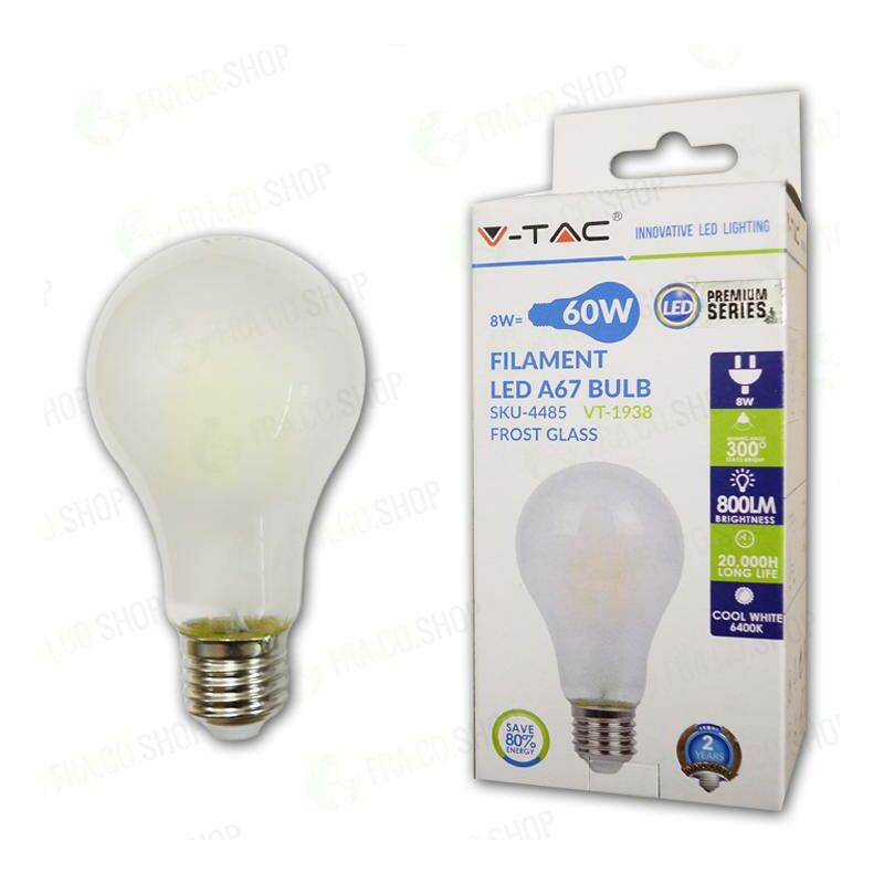 Lampadina LED 8W Filamento E27 A67 Opaco Bianco SKU: 4485: VT: VT-1938 Caratteristiche del prodotto 80% di consumo energetico in meno rispetto alle lampadine standard Lunga durata Nessuna emissione di radiazioni UV e radiazioni non ionizzanti Accensione immediata, nessun tempo di riscaldamento Bassa potenza termica Direttamente sostituibile alle lampade ad incandescenza tradizionali Installazione Aree Commerciali e Residenziali Hotel, Bar Stand espositivi Lampadari Allaperto, esclusivamente allinterno di apparecchi idonei. Specifiche tecniche Informazione generale Attacco E27 Tipo Lampadina A67 Tipo LED Filamento Vitamedia 20000 ore Dati elettrici Potenza 8W Potenza EQV. a incandescenza 60W Tensione AC: 220-240V Frequenza 50Hz Fattore di potenza 50Hz Dati tecnici luce Fascio Luminoso° 300° Colore della luce Bianco Temperatura di colore 6400K Flusso luminoso (lm) 800 lm Indice di resa cromatica Ra >80 Funzionalità Tempo innesco 100% 0.001 secondo Stabilità del colore Intensità