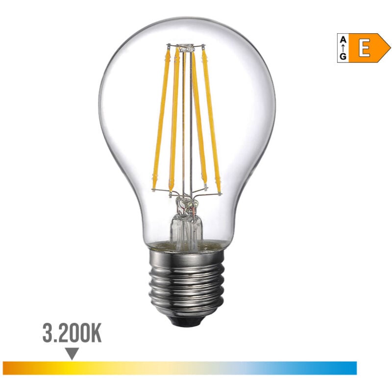 Lampadina LED E27 da 6W, equivalenti a 47W. Schermo luminoso: Bianco caldo 3200K - Flusso luminoso 300° con accensione immediata. Dimensioni: Altezza: 10,5 cm x 6 cm. Lunga durata: 25.000 ore. Classe energetica A+. 2 anni di garanzia. Collegamento AC220-240V.