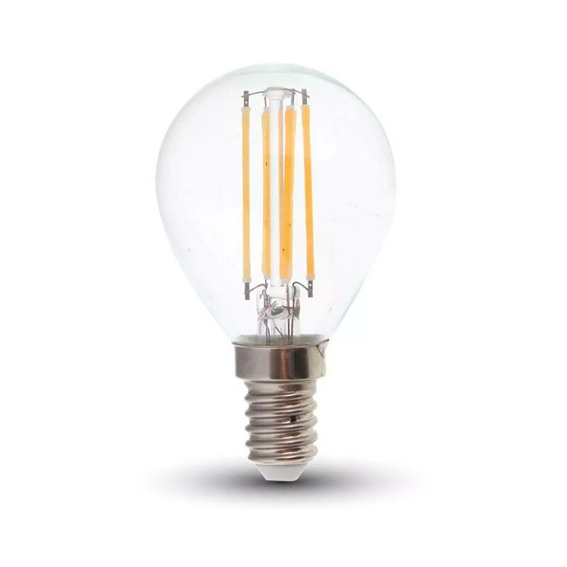 LED Lampadina 6W Filamento E14 P45 trasparente 2700K 130lm/W SKU: 2854: VT: VT-2486 Caratteristiche del prodotto 80% di consumo energetico in meno rispetto alle lampadine standard Lunga durata Nessuna emissione di radiazioni UV e radiazioni non ionizzanti Accensione immediata, nessun tempo di riscaldamento Bassa potenza termica Direttamente sostituibile alle lampade ad incandescenza tradizionali Installazione Aree Commerciali e Residenziali Hotel, Bar Stand espositivi Lampadari Allaperto, esclusivamente allinterno di apparecchi idonei. Specifiche tecniche Informazione generale Attacco E14 Tipo Lampadina P45 Tipo LED Filamento Vitamedia 20 000 ore Dati elettrici Potenza 6W Potenza EQV. a incandescenza 60W Tensione AC:220-240V Frequenza 50Hz Fattore di potenza >0.5 Dati tecnici luce Fascio Luminoso° 300° Efficienza luminosa (lm/W) 130 lm/W Colore della luce Bianco caldo Temperatura di colore 2700K Flusso luminoso (lm) 800 lm Indice di resa cromatica Ra >80 Dettagli corpo Materiale