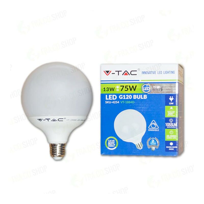 Lampadina LED - 13W G120 Е27 6400K Dimmable SKU: 7195: VT: VT-1884D Caratteristiche del prodotto 80% di consumo energetico in meno rispetto alle lampadine standard Lunga durata Nessuna emissione di radiazioni UV e radiazioni non ionizzanti Accensione immediata, nessun tempo di riscaldamento Bassa potenza termica Direttamente sostituibile alle lampade ad incandescenza tradizionali Installazione Aree Commerciali e Residenziali Hotel, Bar Stand espositivi Lampadari Allaperto, esclusivamente allinterno di apparecchi idonei. Specifiche tecniche Informazione generale Attacco E27 Tipo Lampadina G120 Tipo LED Plastica Vita media 20000 h Dati elettrici Potenza 13W Potenza EQV. a incandescenza 75W Tensione AC: 200-240V Frequenza 50Hz Fattore di potenza >0.7 Dati tecnici Luce Colore della luce Bianco Temperatura di colore 6400K Flusso luminoso 1055 lm Indice di resa cromatica Ra >80 Fascio Luminoso 200° Dettagli corpo Materiale Plastica Colore Bianco Funzionalità Dimmerabile Sì Tempo innesco