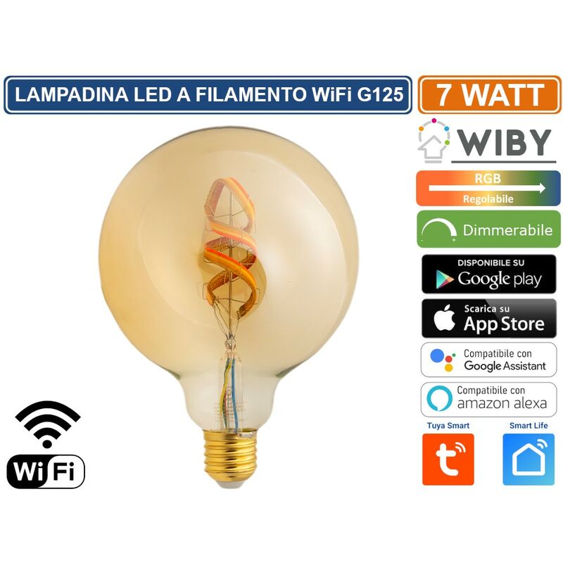 WIBY G125-SF-WIFILIC-RGBW è una lampadina LED a filamento RGB + 1800K da 4.9W di potenza con attacco E27 e tecnologia LED SMD . La sua forma a Globo G125 è realizzata in vetro con finitura ambrata. Con fascio luminoso di 320° e flusso luminoso di 180 lm, questa lampadina ha un rapporto di 37 lm/W . È inoltre dimmerabile, e supporta quindi la regolazione della sua intensità luminosa. I prodotti WIBY sono controllabili direttamente dal proprio smartphone, e sono quindi perfetti per creare un'atmosfera unica e distintiva senza l'installazione di centraline aggiuntive: grazie al loro modulo Wi-Fi integrato, infatti, è possibile comunicare tra i vari dispositivi senza alcun collegamento fisico, gestendo il tutto con un semplice tocco sull' app Tuya oppure Smart life (disponibile gratuitamente per iOS e Android). Tramite applicazione, oppure Amazon Alexa o Google Assistant, è possibile: • Accendere e spegnere il dispositivo • Regolare la temperatura della luce bianca • Regolare la
