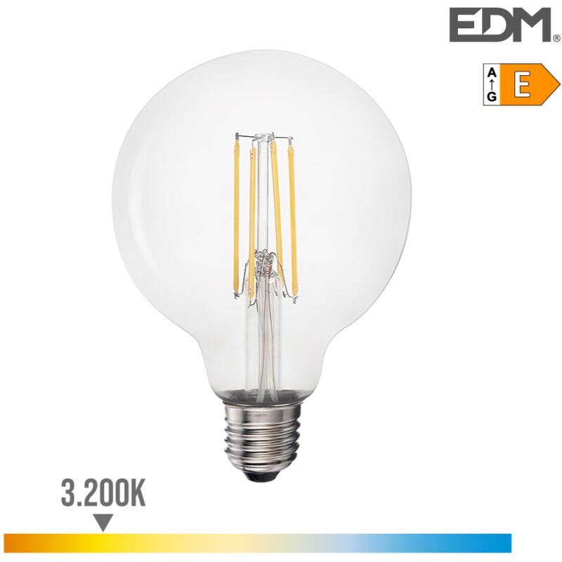 Lampadina a globo con filamento led e27 6w 800lm 3200k luce calda misure: ø9,5x14,5cm (diametro/altezza) 25000h ac 220/240v classe energetica: e. angolo di apertura: 300° edm