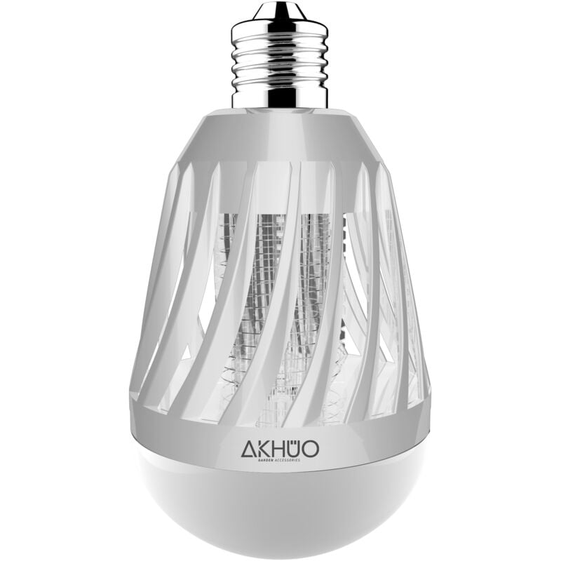 Lampadina insetticida AKHUO in ABS ignifugo. Senza prodotti chimici, odori o liquidi. 2 in 1: illuminazione LED e luce UV antizanzare. li> Illuminazione di 400 lumen e 6500 K. Include spazzola per rimuovere i detriti accumulati. Lampadina con raggio di copertura di 30 m2. li>