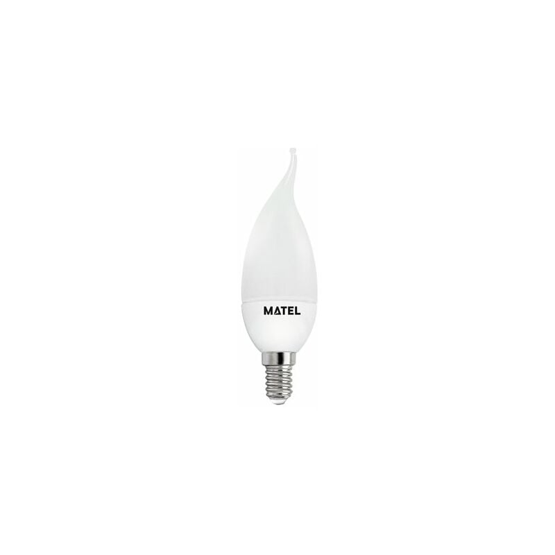 Lampadina LED MATEL a candela con fiamma E14 5W. Classificazione F, risparmio energetico fino al 90%. Tre intensità di illuminazione: 100%/50%/20% . Accensione elettronica istantanea e prestazioni elevate. Angolo di apertura della luce non inferiore a 200°. Carrozzeria in PC bianco con interno in alluminio e cover fumè. Durata media fino a 30.000 ore. Lampadina con temperatura di colore di 6400K (freddo). Installazione diretta, non è necessario alcun trasformatore aggiuntivo. Ideale per ambienti in cui abbiamo bisogno di maggiore chiarezza: cucine, bagni, ecc.