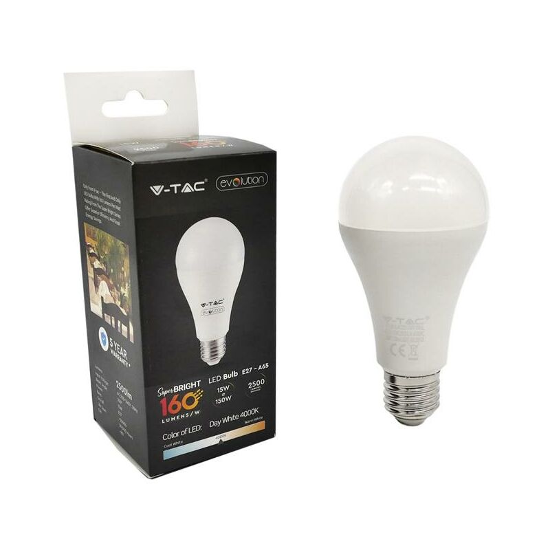 LED Lampadina 15W E27 A60 Plastica 3000K 160 lm/W SKU: 2812: VT: VT-2315 Caratteristiche del prodotto 80% di consumo energetico in meno rispetto alle lampadine standard Lunga durata Nessuna emissione di radiazioni UV e radiazioni non ionizzanti Accensione immediata, nessun tempo di riscaldamento Bassa potenza termica Direttamente sostituibile alle lampade ad incandescenza tradizionali Installazione Aree Commerciali e Residenziali Hotel, Bar Stand espositivi Lampadari Allaperto, esclusivamente allinterno di apparecchi idonei. Specifiche tecniche Informazione generale Attacco Е27 Tipo Lampadina А65 Tipo LED SMD Vitamedia 30 000 ore Dati elettrici Potenza 15W Potenza EQV. a incandescenza 150W Tensione AC: 220-240V Frequenza 50Hz Fattore di potenza >0.5 Dati tecnici luce Fascio Luminoso° 200° Efficienza luminosa (lm/W) 160 lm/W Colore della luce Bianco caldo Temperatura di colore 3000K Flusso luminoso (lm) 2500 lm Indice di resa cromatica Ra >80 Dettagli corpo Materiale Plastica