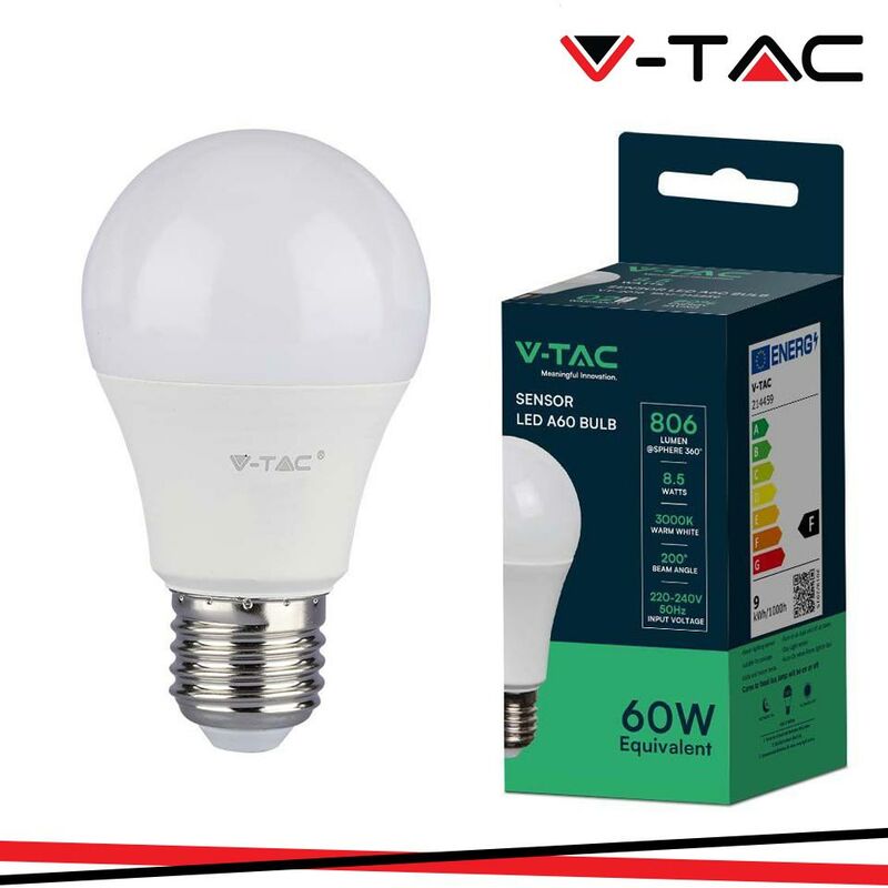 LED Lampadina 8.5W E27 A60 Plastica Sensor 3000K SKU: 214459: VT: VT-2016 Caratteristiche del prodotto 80% di consumo energetico in meno rispetto alle lampadine standard Lunga durata Nessuna emissione di radiazioni UV e radiazioni non ionizzanti Accensione immediata, nessun tempo di riscaldamento Bassa potenza termica Direttamente sostituibile alle lampade ad incandescenza tradizionali Installazione Aree Commerciali e Residenziali Hotel, Bar Stand espositivi Lampadari Allaperto, esclusivamente allinterno di apparecchi idonei. Specifiche tecniche Informazione generale Attacco E27 Tipo LED SMD Vitamedia 20,000 ore Dati elettrici Potenza 8.5W Potenza EQV. a incandescenza 60W Tensione AC:220-240V Frequenza 50Hz Dati tecnici luce Fascio Luminoso° 200° Colore della luce Bianco caldo Temperatura di colore 3000K Flusso luminoso (lm) 806 lm Indice di resa cromatica Ra >80 Dettagli corpo Materiale Termoplastica Funzionalità IP Protezione IP20 Tempo innesco 100% 0.001 secondo Numero cicli