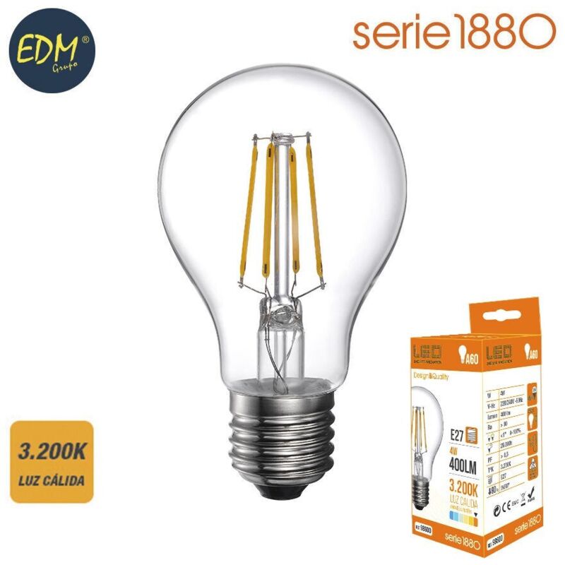 Acquista su Patner Iberia i migliori strumenti e accessori per la casa e il lavoro > Riferimento: E3/98600 Lampadina Standard Con Filamento Led E27 4W 550Lm 3200K Misurazioni Luce Calda: Ø6X10.5Cm (Diametro/Altezza) 25000H Ac 220/240V Classe energetica: E. Angolo di apertura: 300° Edm