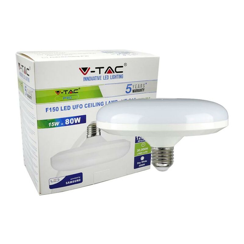 LED Lampadina - SAMSUNG CHIP 15W E27 UFO F150 3000K SKU: 213: VT: VT-216 Caratteristiche del prodotto 80% di consumo energetico in meno rispetto alle lampadine standard Lunga durata Nessuna emissione di radiazioni UV e radiazioni non ionizzanti Accensione immediata, nessun tempo di riscaldamento Bassa potenza termica Direttamente sostituibile alle lampade ad incandescenza tradizionali Installazione Aree Commerciali e Residenziali Hotel, Bar Stand espositivi Lampadari Allaperto, esclusivamente allinterno di apparecchi idonei. Specifiche tecniche Informazione generale Attacco E27 Tipo Lampadina F150 Tipo LED SAMSUNG Chip Vita media 30 000 h Dati elettrici Potenza 15W Potenza EQV. a incandescenza 80W Tensione AC: 220-240V Frequenza 50Hz Fattore di potenza >0.5 Dati tecnici Luce Colore della luce Bianco caldo Temperatura di colore 3000K Flusso luminoso 1200 lm Indice di resa cromatica Ra >80 Fascio Luminoso 120° Dettagli corpo Materiale Termoplastico Colore Bianco Funzionalità