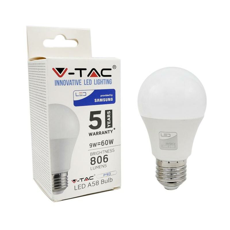 LED Lampadina SAMSUNG Chip 9W E27 A58 Plastica 4000K SKU: 229: VT: VT-210 Caratteristiche del prodotto 80% di consumo energetico in meno rispetto alle lampadine standard Lunga durata Nessuna emissione di radiazioni UV e radiazioni non ionizzanti Accensione immediata, nessun tempo di riscaldamento Bassa potenza termica Direttamente sostituibile alle lampade ad incandescenza tradizionali Installazione Aree Commerciali e Residenziali Hotel, Bar Stand espositivi Lampadari Allaperto, esclusivamente allinterno di apparecchi idonei. Specifiche tecniche Informazione generale Attacco E27 Tipo Lampadina A58 Tipo LED SAMSUNG Chip Vitamedia 30000 ore Dati elettrici Potenza 9W Potenza EQV. a incandescenza 60W Tensione AC: 220-240V Frequenza 50Hz Fattore di potenza 50Hz Dati tecnici luce Fascio Luminoso° 200° Colore della luce Bianco naturale Temperatura di colore 4000K Flusso luminoso (lm) 806 lm Indice di resa cromatica Ra >80 Dettagli corpo Materiale Termoplastico Funzionalità IP Protezione