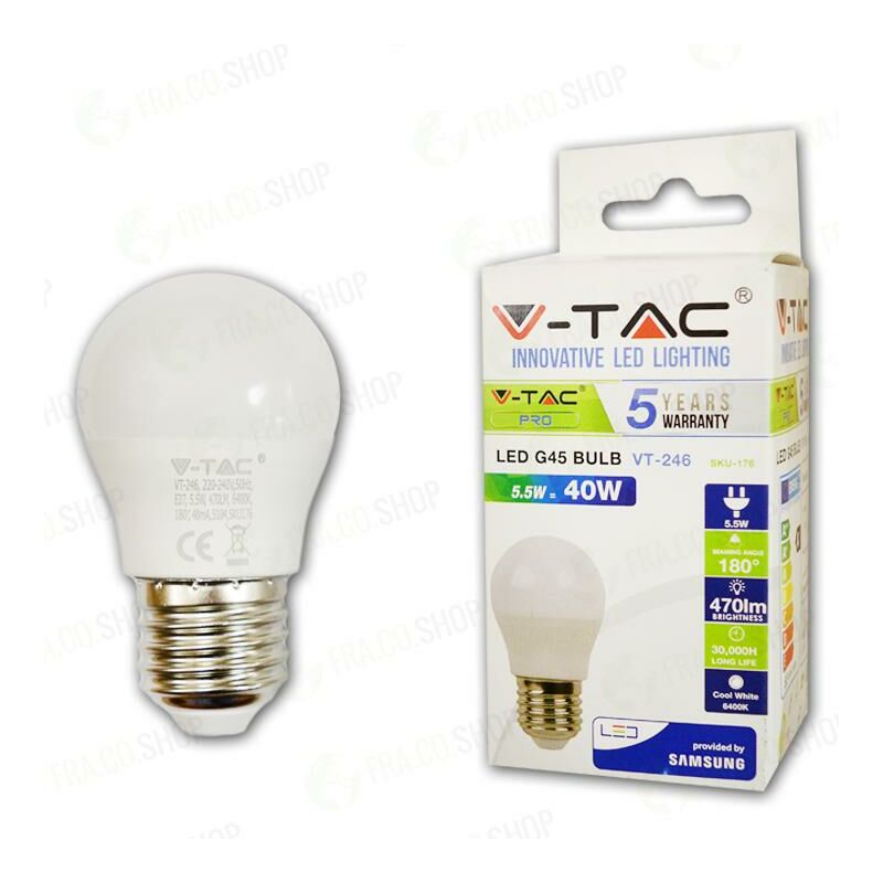 Lampadina LED - SAMSUNG Chip 5.5W E27 G45 Plastica Bianco Naturale SKU: 175: VT: VT-246 Caratteristiche del prodotto 80% di consumo energetico in meno rispetto alle lampadine standard Lunga durata Nessuna emissione di radiazioni UV e radiazioni non ionizzanti Accensione immediata, nessun tempo di riscaldamento Bassa potenza termica Direttamente sostituibile alle lampade ad incandescenza tradizionali Installazione Aree Commerciali e Residenziali Hotel, Bar Stand espositivi Lampadari Allaperto, esclusivamente allinterno di apparecchi idonei. Specifiche tecniche Informazione generale Attacco E27 Tipo Lampadina G45 Tipo LED SAMSUNG Chip Vita media 30 000 h Dati elettrici Potenza 5.5W Potenza EQV. a incandescenza 40W Tensione AC: 220-240V Frequenza 50Hz Fattore di potenza >0.5 Dati tecnici Luce Colore della luce Bianco naturale Temperatura di colore 4000K Flusso luminoso 470 lm Indice di resa cromatica Ra >80 Fascio Luminoso 180 ° Dettagli corpo Materiale Termoplastico Colore Bianco