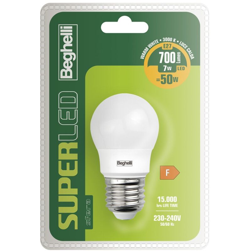 Lampadina superled sfera e27 7w 3000k lumen: 700 watt: 7 attacco: e27 luce: calda temp. colore k: 3000 dim. Øxl: 45x73 vita (h): 15000 classe energetica: f le lampade super led beghelli hanno una buona efficienza e con flussi fino 1500 lumen sono la soluzione economica per ogni installazione standard. angolo fascio 160° - ra >80 avvertenza: lampadina led non dimmerabile, non utilizzare con variatori di luce.