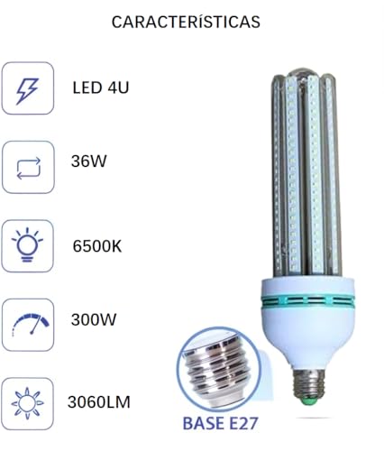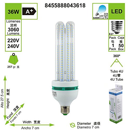 Luce bianca a led E27 4U 36W, uscita 3060 lumen, 2835 SMD, 6000K. La lampadina a LED da 36W può sostituire la tradizionale lampadina a incandescenza da 360W. Più efficiente dal punto di vista energetico rispetto a CFL, sodio incandescente e alogeni ad alta pressione e alogenuri