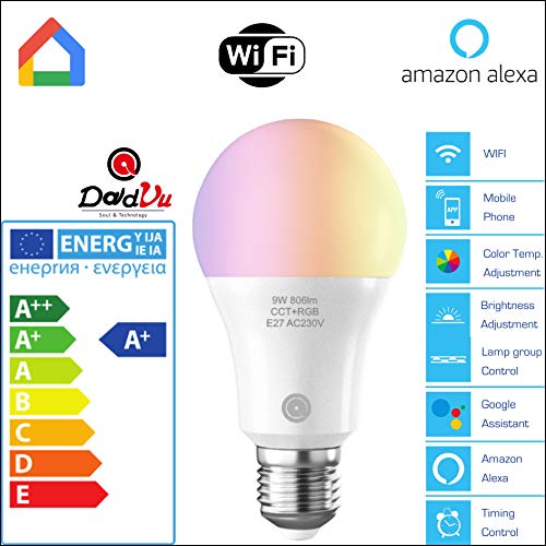 Lampadina Led Wifi Dadvu DV-E27W, RGB con regolazione colore e luminosità, 9w, compatibile Alexa e Google Home, App DadVu (Smart Life - Tuya)