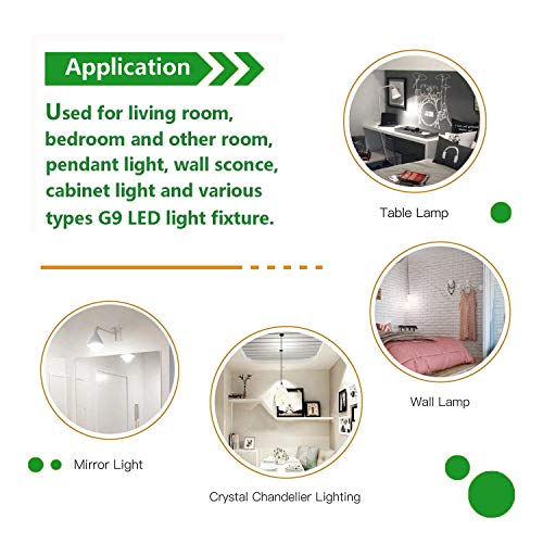 APPLICAZIONE COMPLETA: uso pratico Le lampadine G9 Cool White possono essere ampiamente utilizzate in quasi tutte le applicazioni come Plafoniere, Lampade da parete, Illuminazione bagno, Caffetteria, Casa, Illuminazione paesaggistica, Illuminazione architettonica, Ristoranti, Alberghi, Illuminazione ambientale, Gallerie d'arte e così via sopra.