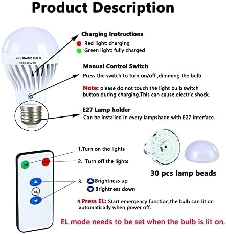 【Lampadina ricaricabile con telecomando】 -La lampadina è alimentata a batteria, batteria al litio ricaricabile incorporata. La lampadina di backup della batteria può durare per 10 ore dopo essere stata completamente caricata. È possibile utilizzare il telecomando per accendere/spegnere o attenuare la lampadina entro 16FT.