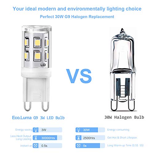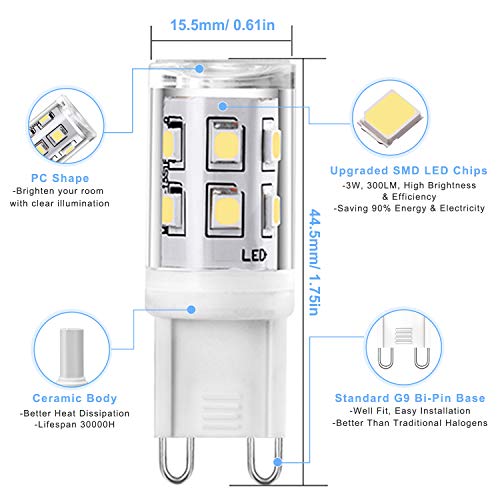 【Alta luminosità, risparmio energetico A +】 Design minuscolo: lampadine LED G9 Dimensioni: 15,5 x 44,5 mm. Consumo energetico: 3W (sostituzione per lampadine alogene da 30W). Lumen: 300 Lumen. Rispetto alle lampadine tradizionali, le lampadine a LED G9 consumano solo 3 W che possono sostituire la lampadina alogena da 30 W e risparmiare oltre il 90% sulla bolletta dell'illuminazione.
