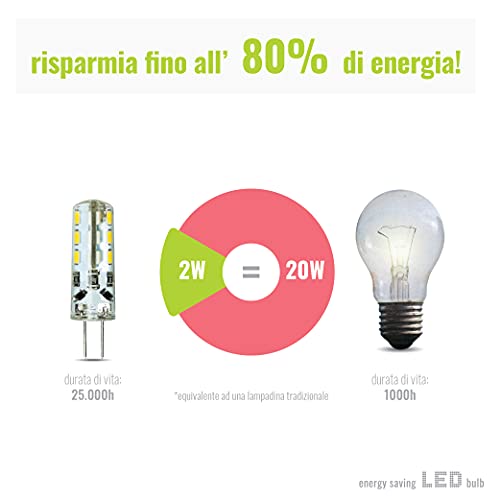 ✅ Lampada LED G4 12V AC / DC: la tensione di lavoro della nostra lampada LED G4 è 12V AC / DC. Potenza di 2W che funge da sostituto per le lampade alogene da 20 W sostituite, risparmiando il 80% sulla bolletta dell'elettricità - 170 Lumen di potenza luminosa - LUCE CALDA 3000K.