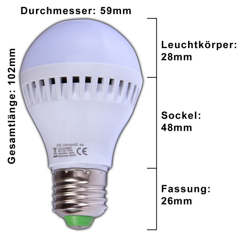 Dimensioni Diametro: 59 mm, corpo lampada: 28 mm. Attacco interno: 48 mm, attacco esterno 26 mm, lunghezza complessiva: 102 mm.