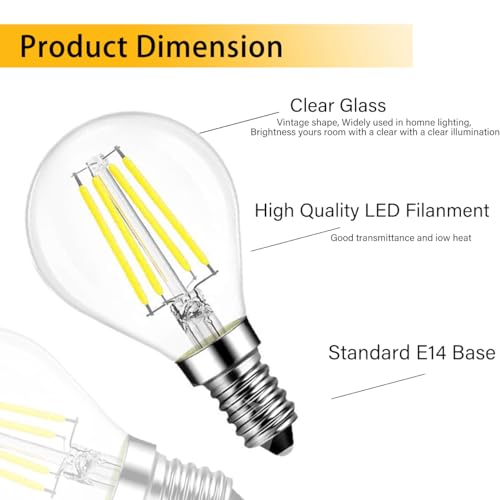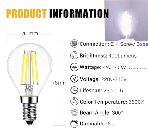 Facile installazione: forma G45 con attacco standard E14. Il diametro della vite è di 14 mm, può essere facilmente montato al posto delle normali lampadine alogene E14, durata > 15000 ore, angolo del fascio: 360 gradi.
