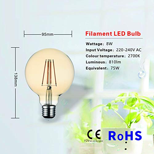 SD LUX E27 8W lampadine LED globo vintage filamento LED G95 Amber No Flicker Edison vite lampadine-8W 810LM (equiv 75W) bianco caldo 2700K, non dimmerabile, 2 confezioni [classe energetica A+]