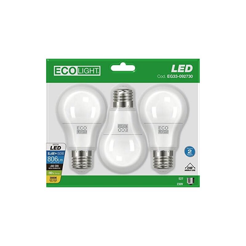 Set 3 lampadine Led a goccia Base della lampadina: E27 Potenza: 60W Watt consumo: 8.8W Lumen resi: 820 Colore luce: 6400K Apertura fascio: 240° Volt: 230V