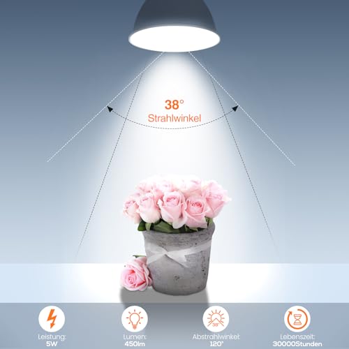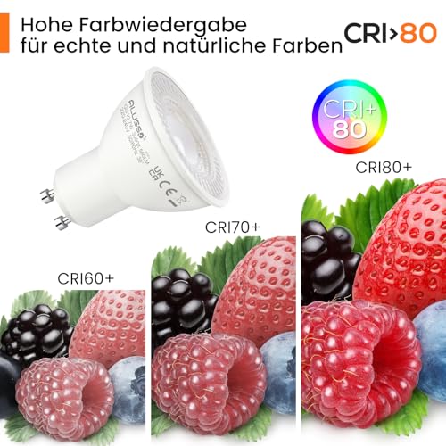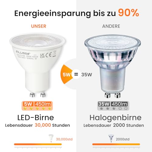 【Luce piacevole】ALUSSO lampadine a LED GU10, che sono luminose come le lampadine alogene da 35 W, consumano solo il 10% di energia, che consumano le lampadine alogene, ma forniscono ancora 450 lumen di potenza luminosa e un preciso colore bianco freddo 6000K. Grazie a un angolo del fascio di 38 gradi, queste lampadine possono produrre un proiettore uniforme per l'illuminazione generale. Non dimmerabile.