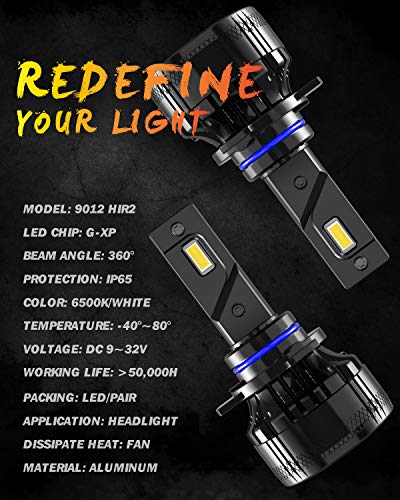 ★ 【Lampadine per fari a LED 9012 HIR2】 Potenza: 110 W/set (55 W per lampadina). Lumen: 20.000 LM/Set (10.000 Lumen per lampadina). Tensione di funzionamento: DC9-32V (adatto per veicoli 12V, 24V). Chip LED CREE G-XP. Bianco Xenon 6500K estremamente luminoso. Il design del fascio di luce super focalizzato offre una gamma di illuminazione più ampia e più ampia, 300% più luminosa rispetto ai fari alogeni di serie.
