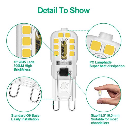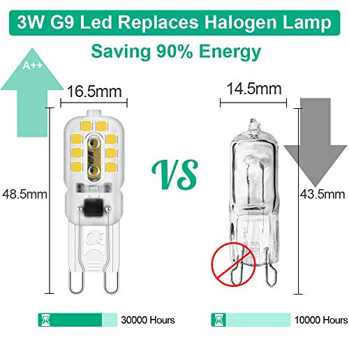 【 Risparmio energetico】3W LED g9 con perline 16SMD 2835 sostituisce lampadine a incandescenza e alogene da 30W, risparmiando fino al 90% sulla bolletta dell'elettricità. La durata della vita è di 30000 ore, il che riduce i costi riducendo la frequenza di sostituzione.