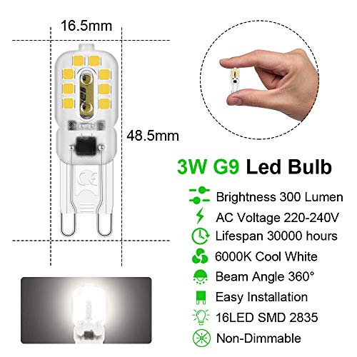Lampadine led G9 3w, Luce Bianca Fredda 6000K, 300Lm CA230V, Nessun Sfarfallio Non Dimmerabile, Equivalente a 30W Lampada Alogena per l'illuminazione, 10 Pezzi [Classe di efficienza energetica A++]