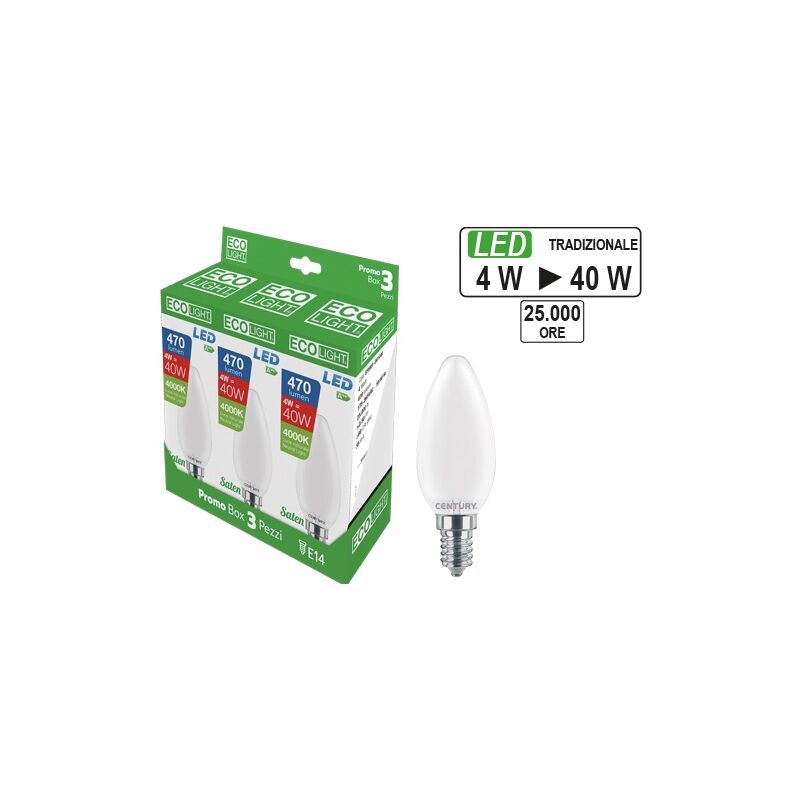 Lampadina a Led con attacco E14 (piccolo) utilizzabile su qualsiasi lampadario o plafoniera CARATTERISTICHE Lampadine Ecolight Led Saten Oliva Conf. 3 pz. Tecnologia Led in classe A++. Consumi ridotti del 90%. Potenza effettiva 4 Watt - 4000 K Potenza equivalente 40W Lumen 470 Attacco E14. TEMPERATURA DI COLORE