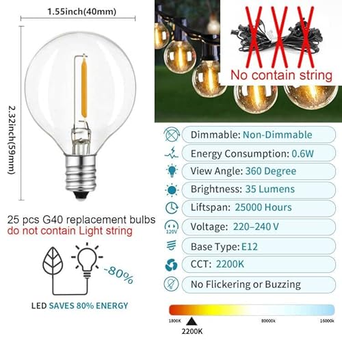 Decorazione perfetta: 25 lampadine di ricambio G40, per catene luminose in interni ed esterni, non contiene catene luminose. Sono ideali per camera da letto, soggiorno, casa, terrazza, ponti, cortili, veranda, giardino, balcone, ristorante, bar, caffè, bistrò, matrimonio, compleanno, festa, Natale, Halloween e tutte le feste speciali