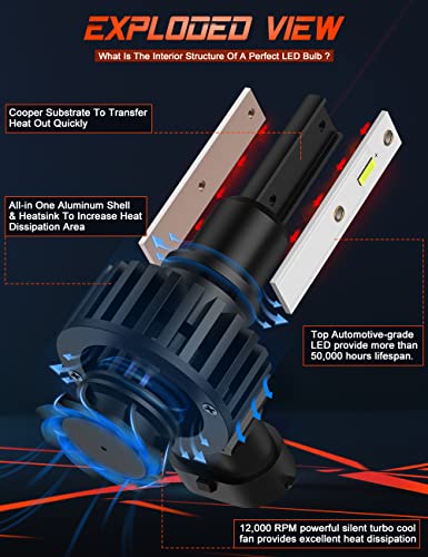 【LONGEVITÀ SUPERIORE】Il substrato termicamente conduttivo della lampadina del faro LED H11 recentemente aggiornato nel 2022 è esteso nella ventola di raffreddamento del turbo, combinato con il corpo della lampada in alluminio aeronautico 6063, per migliorare l'effetto di dissipazione del calore e fornire una capacità di raffreddamento unica. Garantisce oltre 50.000 ore di servizio e mantiene sempre i fari alla massima luminosità.