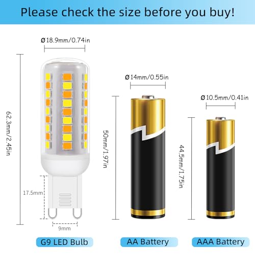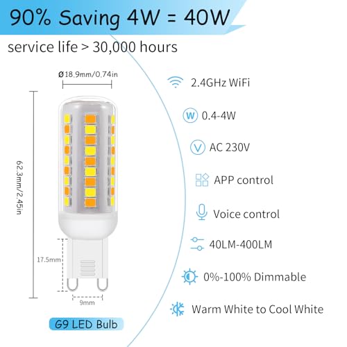 【Wi-Fi Dimmable Smart G9 Light Bulb】: Dimensioni: 62,3 mm * 18,9 mm, temperatura del colore da 2700K a 6500 Kelvin e la luminosità tra 1% -100%, 40LM-400LM, scuro a luminoso, facile essere conrol dal telefono cellulare.(Nota: Built-in chip di controllo intelligente, non compatibile con dimmer!)
