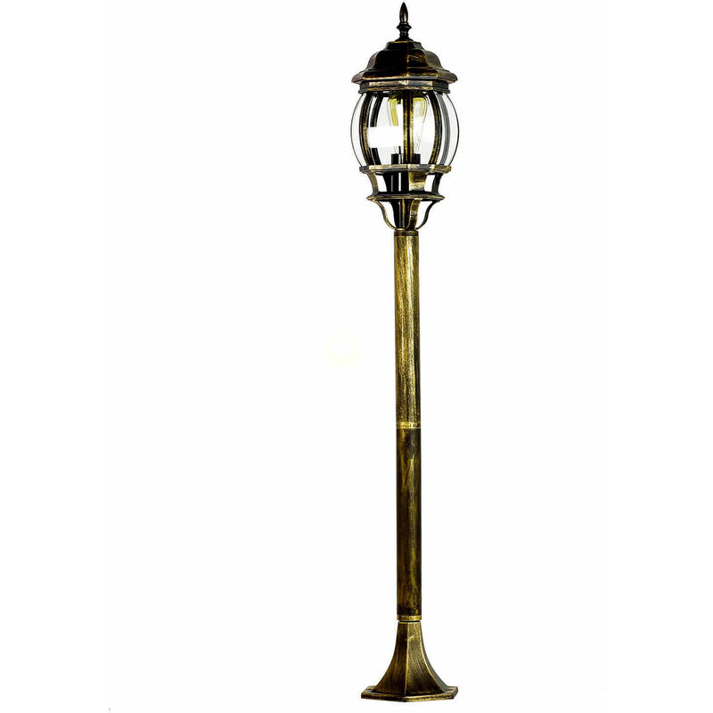 Dettagli del prodotto Materiale: Alluminio, vetro vero Dimensioni: larghezza: 155 mm, altezza: 1155 mm, lunghezza: 155 mm Attacco: 1x E27 fino a. 60 Watt Classe di protezione dagli spruzzi: IP23 Colore: Oro nero Peso: 1800 grammo Descrizione del prodotto La classica forma a lanterna e i dettagli curvilinei della lampada rustica ne fanno non solo un elemento decorativo che attira l'attenzione ma anche un raffinato ornamento che dona carattere all'ambiente. L'ampia diffusione della luce garantisce un'illuminazione sicura ed efficiente nelle zone d'ingresso, cortili, porticati, giardini e terrazzi. Attacco: E27 con una potenza max. di 60 W. Brest ha una grande versatilità: compatibile con LED e lampade a risparmio energetico. In questo modo si può personalizzare la scelta della lampadina e decidere a propria discrezione, quale efficienza energetica o quale luminosità adottare La tonalità del rame è lavorata a mano, pertanto sono possibile leggere variazioni di colore (più chiare/scure)