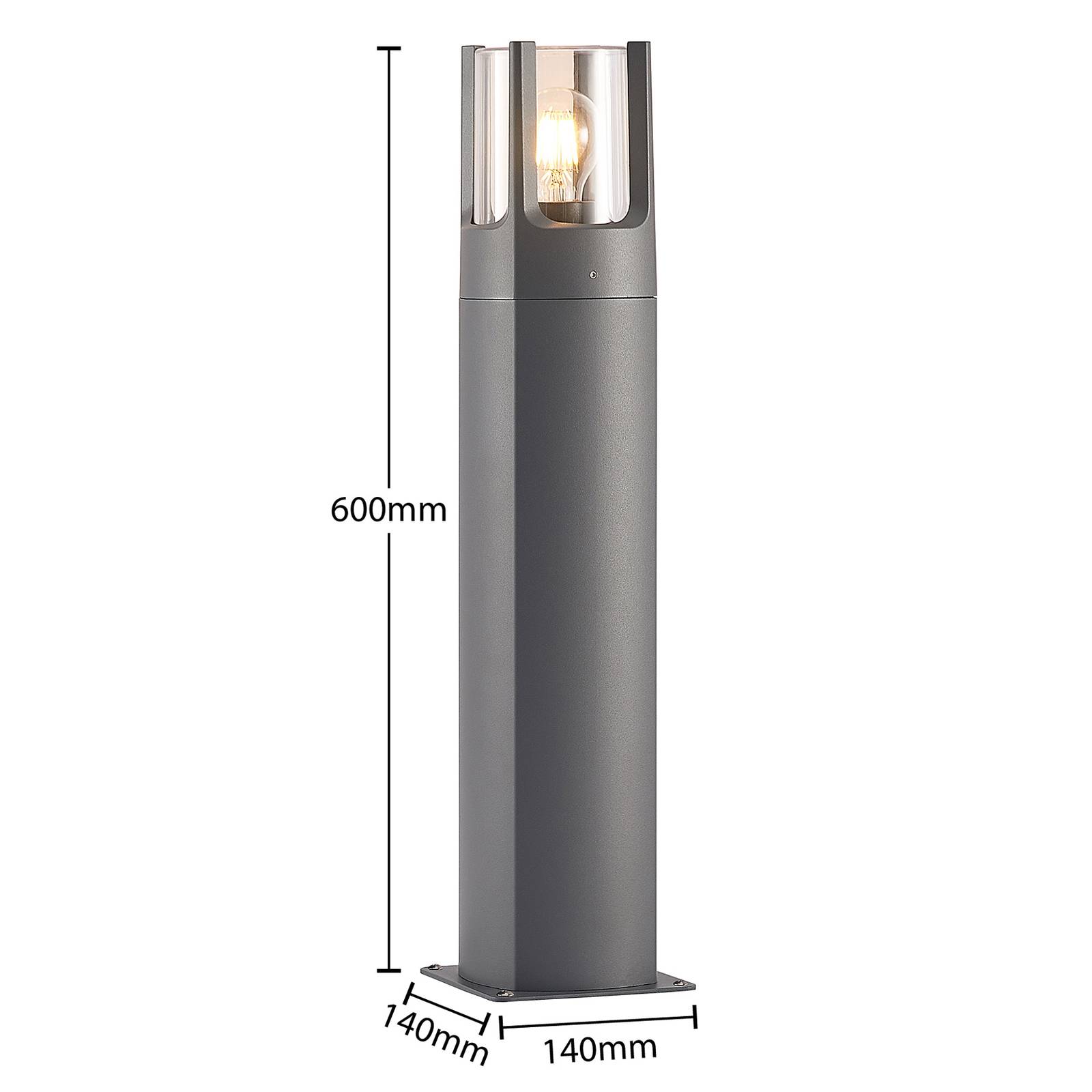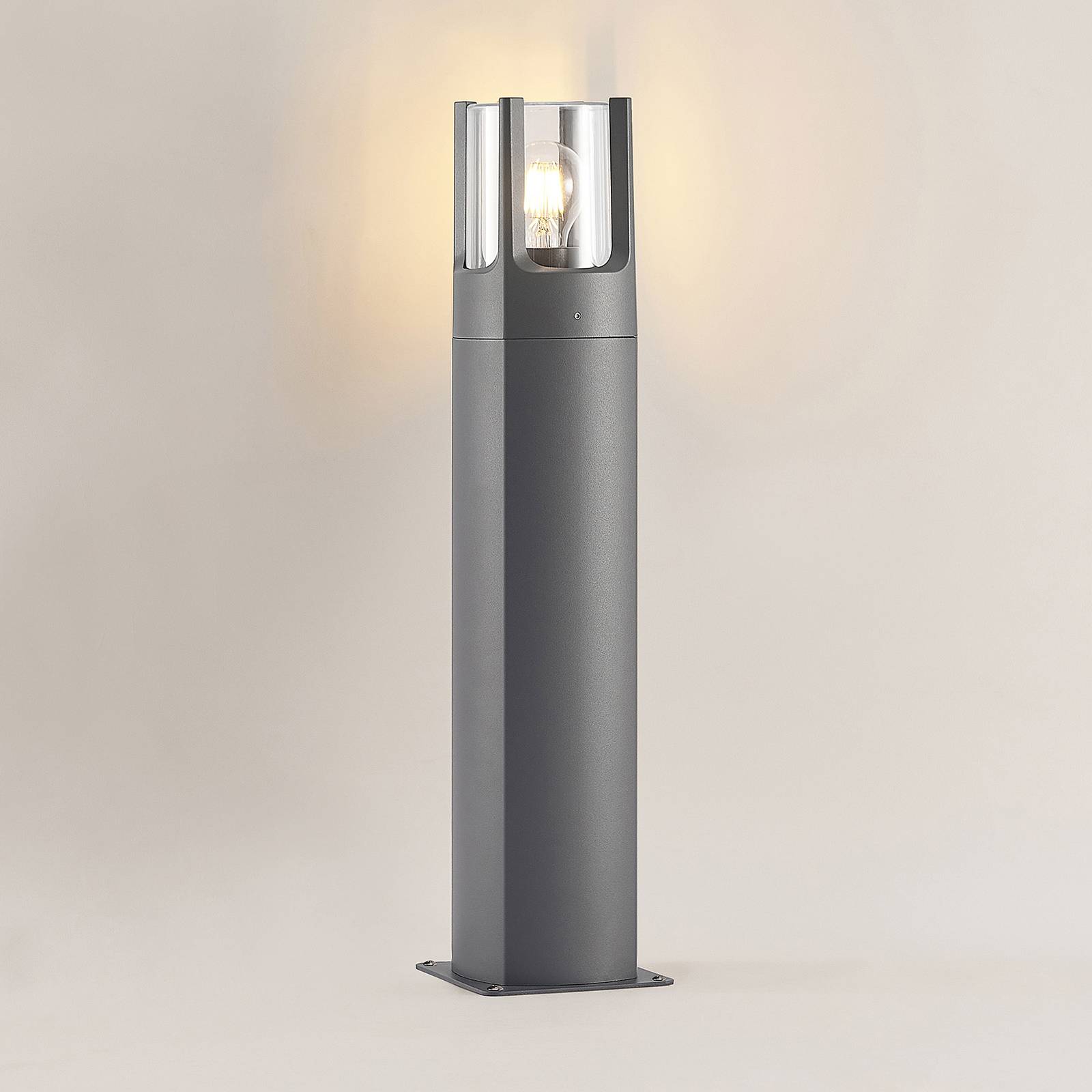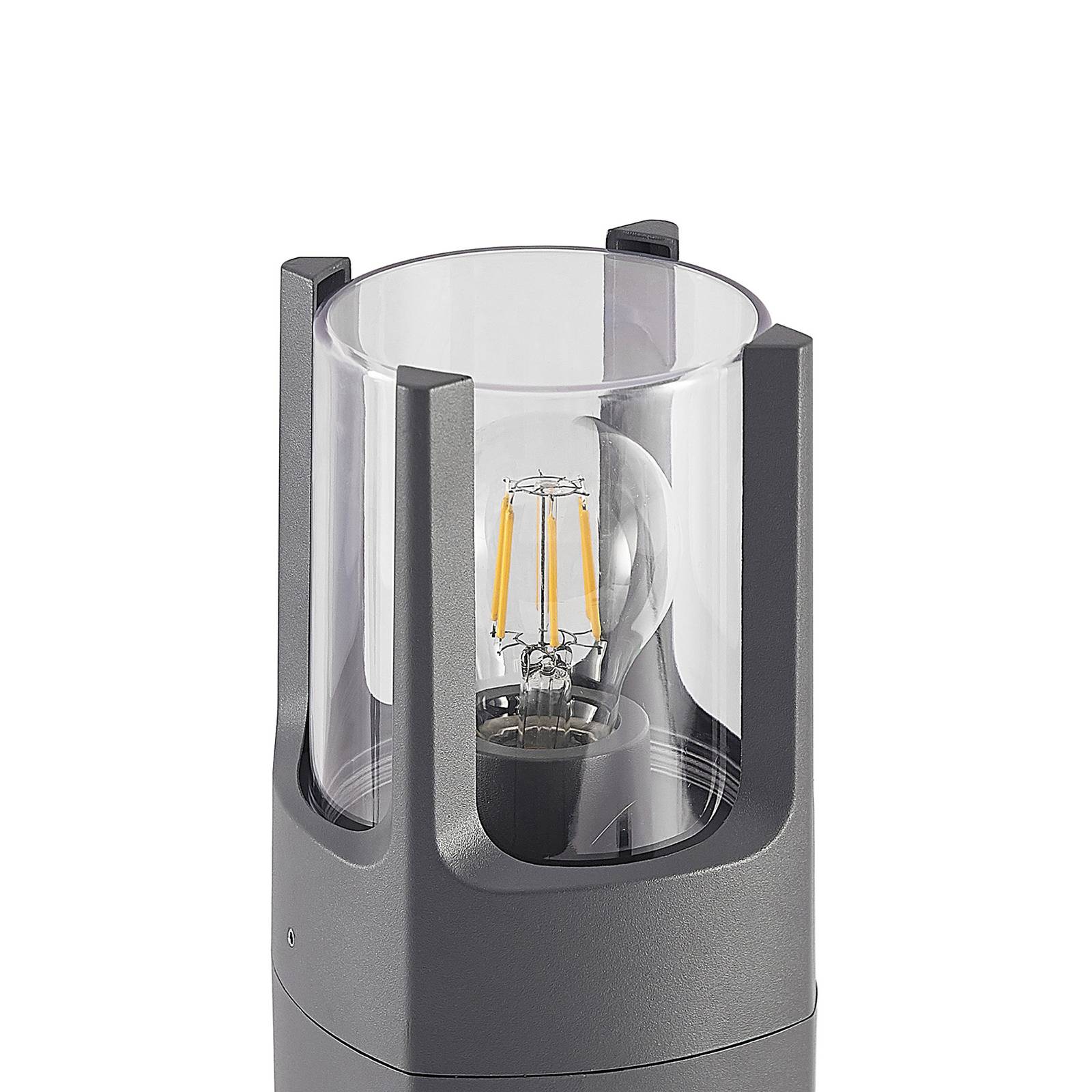 Fardin scuro con paralume trasparente Fardin è un moderno lampione che si distingue per il suo design insolito. Ha una robusta struttura in alluminio pressofuso con finitura grigio scuro. Sotto il paralume trasparente si trova una lampadina E27, che può essere montata con una sorgente luminosa adeguata. L'ideale sarebbe che la sorgente luminosa fosse decorativa per enfatizzare ulteriormente l'impressione generale di questo lampione. Grazie al suo buon grado di protezione, Fardin è ben protetto dagli spruzzi d'acqua e può quindi essere utilizzato all'aperto in modo affidabile per lungo tempo.