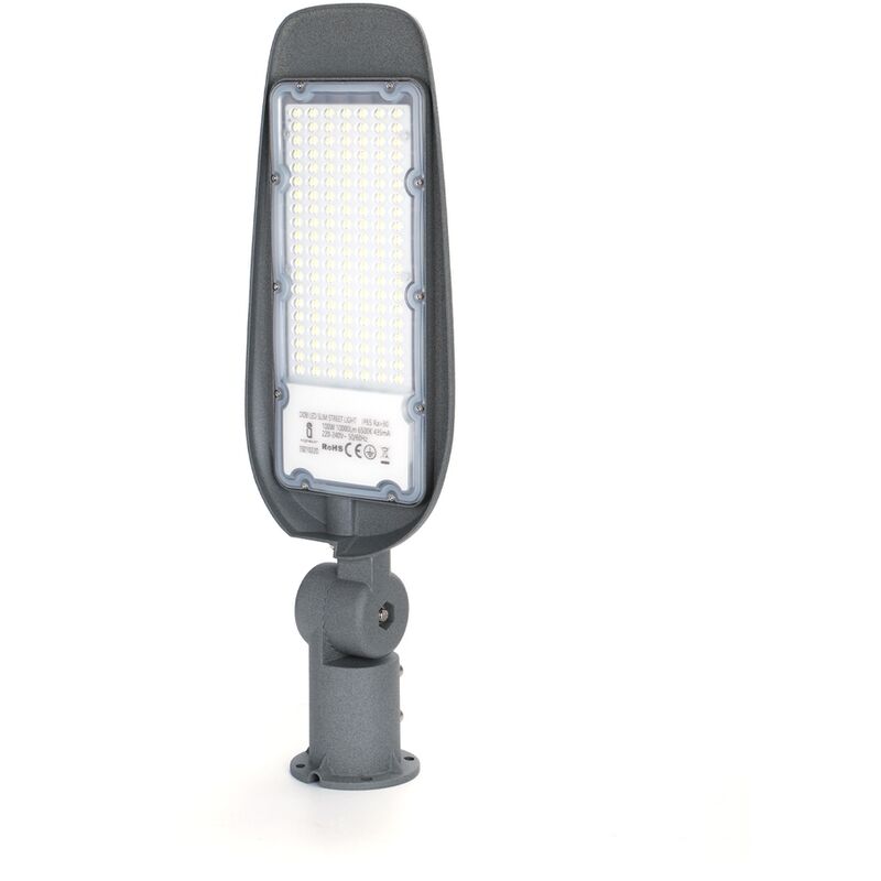 Un lampione stradale LED è un tipo di lampione che utilizza la tecnologia a LED per produrre luce e illuminare le strade. I lampioni stradali LED sono progettati per fornire una fonte di luce efficiente dal punto di vista energetico, con una lunga durata e una maggiore luminosità rispetto ai lampioni tradizionali.Il lampione emette un fascio di luce fredda da 130°x75° dalla potenza di 100W, il che garantisce il massimo dell'energia raggiungibile nella categoria. Questo modello, costruito in alluminio di colore grigio, può essere utilizzato all'esterno perché protetto totalmente dalle polveri e dai getti d'acqua, oltre ad avere un grado di resistenza agli urti pari a IK08. Il diametro del foro per fissare il lampione su un pale è di 54 mm.