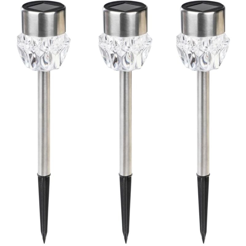 Date un tocco decorativo al vostro giardino con questo set di 3 luci a LED solari della HI! Le lampade combinano la funzionalit con un design in silicio amorfo con luci di diversi colori. Con abbastanza sole durante il giorno, le luci regalano un bagliore radioso di notte! Sono progettate con un interruttore on/off. _ossibile spegnere facilmente le lampade per risparmiare energia quando le luci non sono in uso. Colore luce: Bianco caldo Materiale: Acciaio inox, plastica Dimensioni: 6,7 x 34,5 cm (Diametro x A) Dimensioni del pannello solare: 3 x 3 cm (L x P) Lampada a LED solare Silicio amorfo LED con lenti in plastica Con interruttore on/off Batteria richiesta: AA NI-MH (inclusa)
