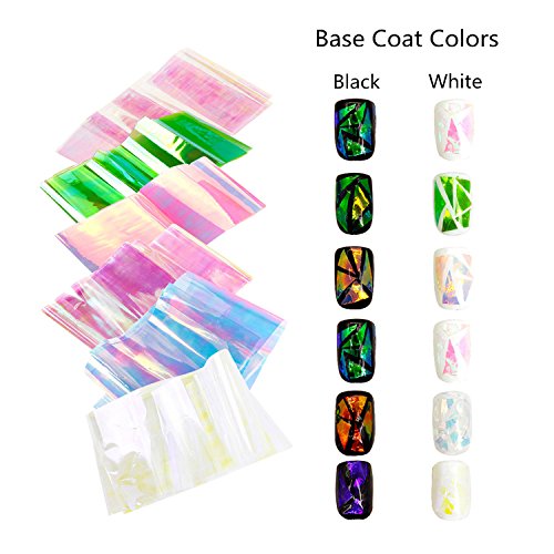 6 colore diverso foglio chiodo rotto, può essere tagliato in forma il tuo preferito, e creare l'arte design delle unghie senza precedenti da soli, non solo un effetto, la superficie è effetto a specchio, apparirà colori diversi in diversa angolazione sotto la luce