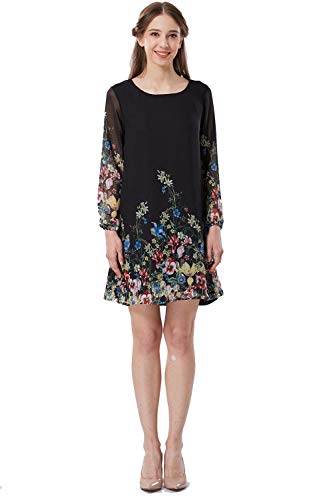 Landove Mini Vestiti Donna Eleganti da Cerimonia Sera Cocktail Abito Stampato Floreale Manica Lunga Rotondo Collo Sciolto Sottile Vestito in Chiffon Corto Autunno Inverno Boho Chic Abiti