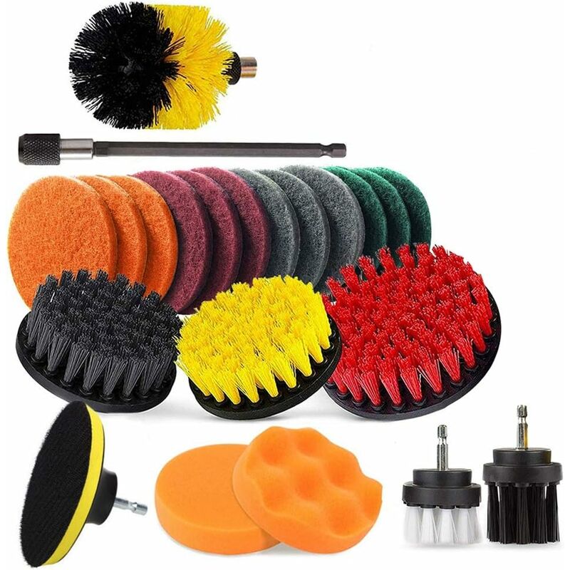 22 in 1 Include - 4 spazzole in nylon di diverse dimensioni: spazzola bianca e nera da 2 pollici + spazzola a cono gialla da 2,5 pollici + spazzola piatta gialla e nera da 4 pollici + spazzola piatta rossa da 5 pollici ;