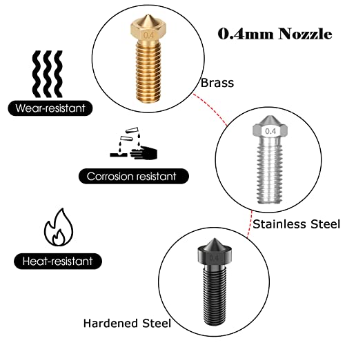 Confezione: 5 pezzi in acciaio temprato + 5 pezzi in acciaio inossidabile + 5 pezzi ugelli in ottone per alte temperature. Questo kit contiene un totale di 15 pezzi di ugelli da 0,4 mm in tre materiali.