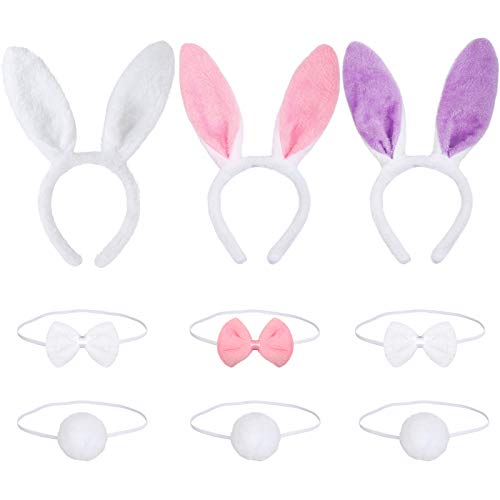 Orecchie da Coniglio Pasquale: Otterrai 3 fasce da coniglio di diversi colori, 3 code di coniglio, 3 papillon, fasce per orecchie da coniglio, papillon e soffici code di coniglio per formare un simpatico costume da coniglio.Il colore soddisfa le tue esigenze quotidiane di abbinamento o cosplay con gli amici.