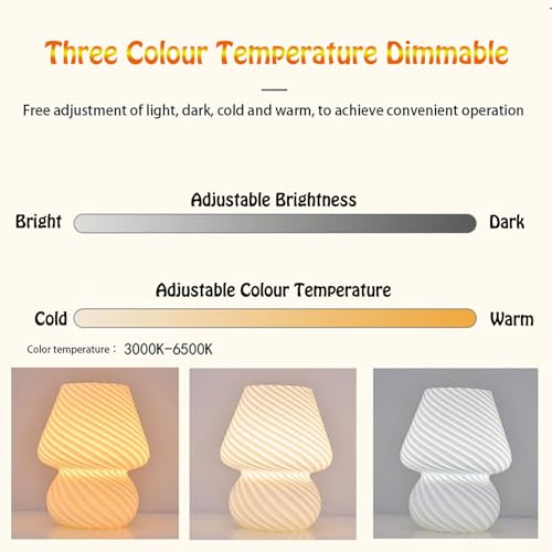 【Lampada da tavolo decorativa】lampada da tavolo in stile moderno con motivo a strisce bianche, forma di piccolo fungo con strisce ondulate visibili e design sofisticato. La piccola lampada da tavolo in vetro ha un aspetto snello, elegante e raffinato