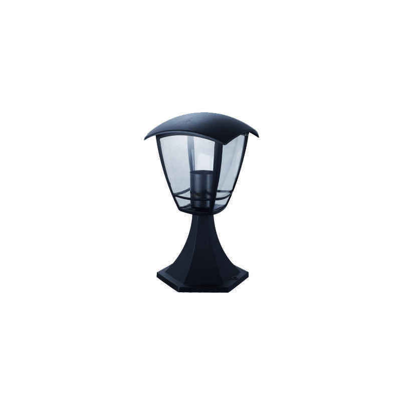 Corpo in alluminio pressofuso colore nero, schermo di protezione in policarbonato trasparente a 4 facce, attacco e27. certificazioni ip44. dimensioni 16x16xh28 cm.